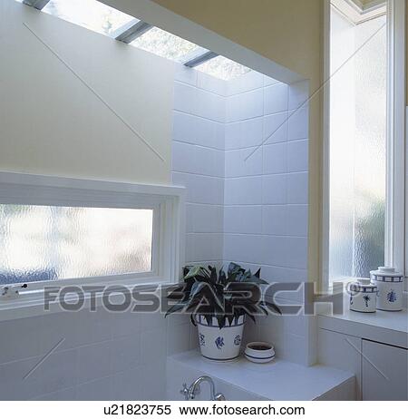 - Etroit Opaque Fenetre Verre Et Houseplant Sur Toilette Dans Moderne Blanc Salle Bains Extension Banques De Photographies U21823755 Fotosearch